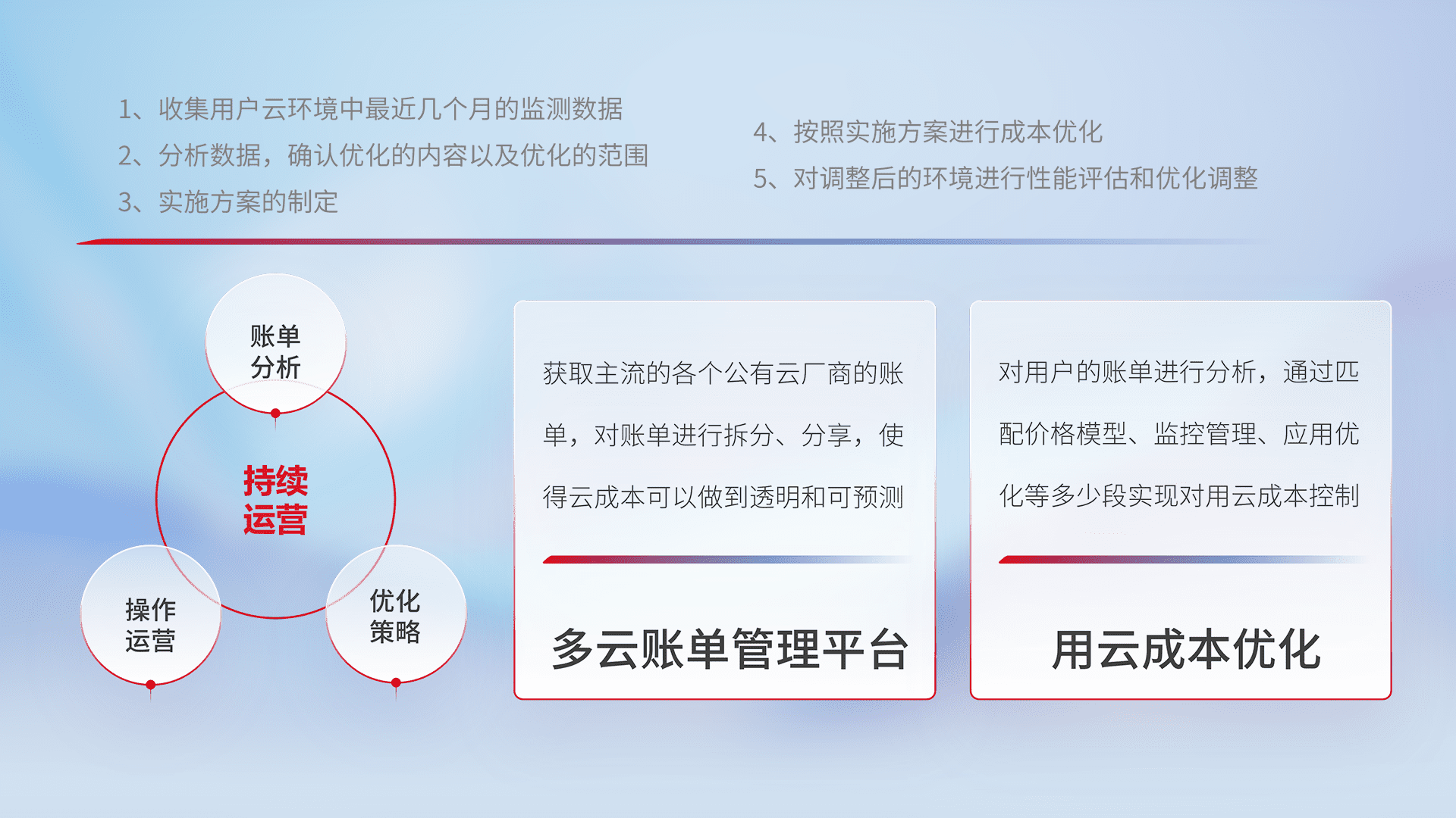 通过多云纳管,,以统一的资源数据模型把客户的云资源进行抽象和封装,,,,进而实现对多云资源的统一操作,,,保障云资源管理的可靠性、、稳定性与可用性。。。量身定制化运维内容,,,配置、、开发运维、、、、补丁管理、、、备份、、、、监控、、认证和访问管理、、、审计和日常巡检等,,,,保障在用云过程中的可靠度,,稳定度以及高可用率。。。